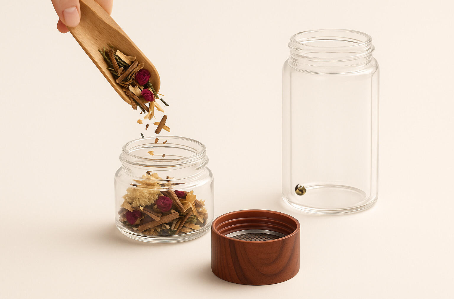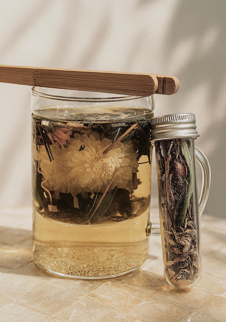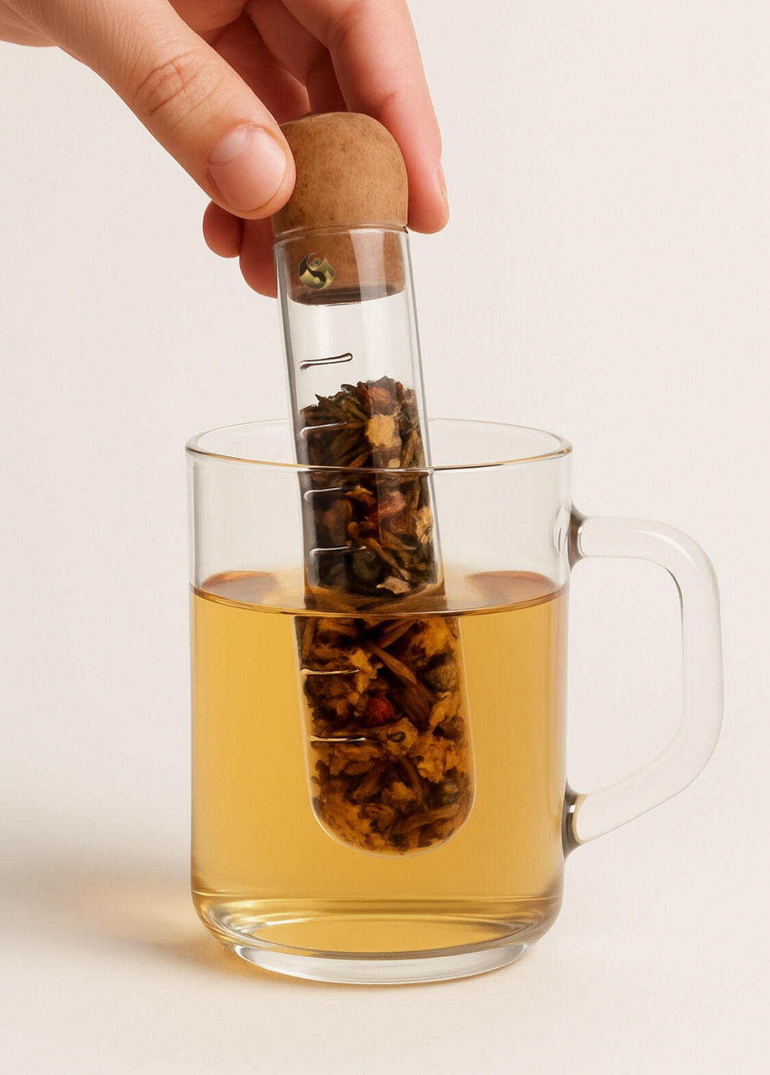 | Thuyết minh | Ống trầm bông thuỷ tinh dùng để đựng hoa trà một lần pha, hoặc gửi tặng một ai đó một buổi uống trà nhỏ. Thả ống vào nước nóng, để hương thảo bung nở bên trong, rồi nhấc ra như một nghi thức khép lại. Tái sử dụng sau mỗi lần rửa sạch. |